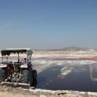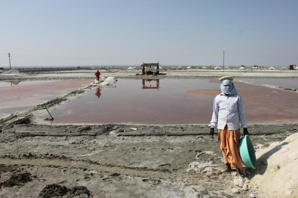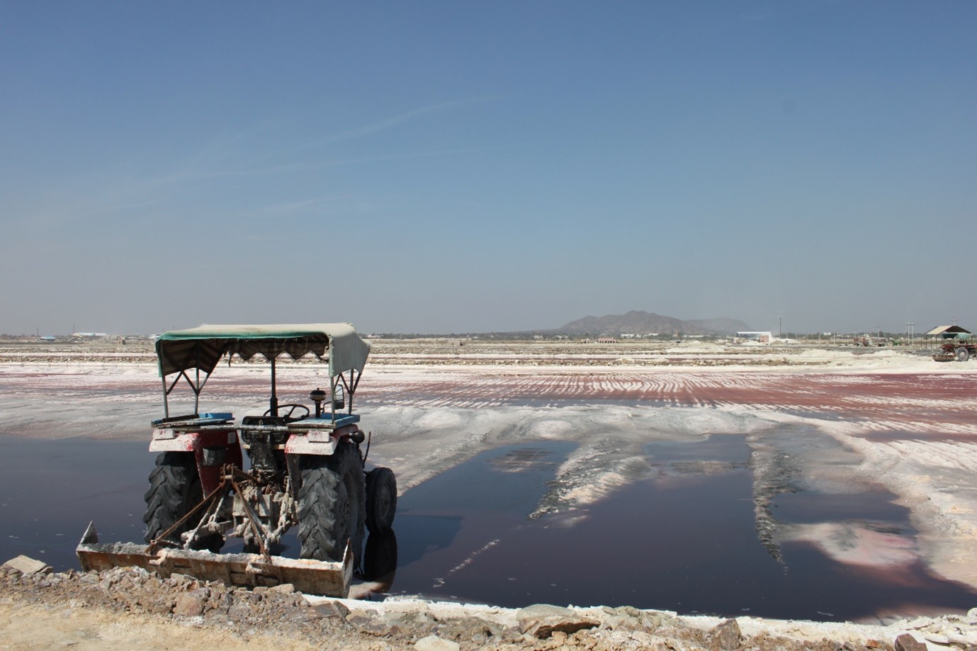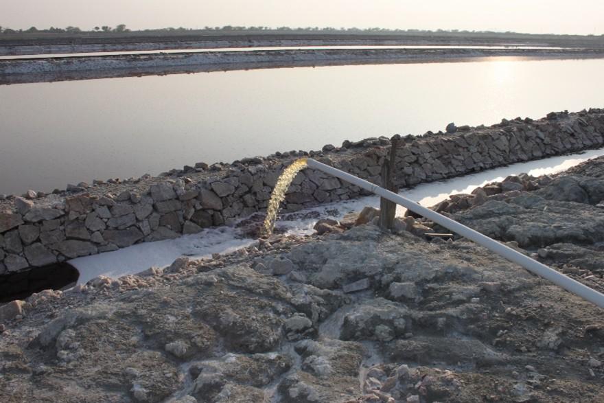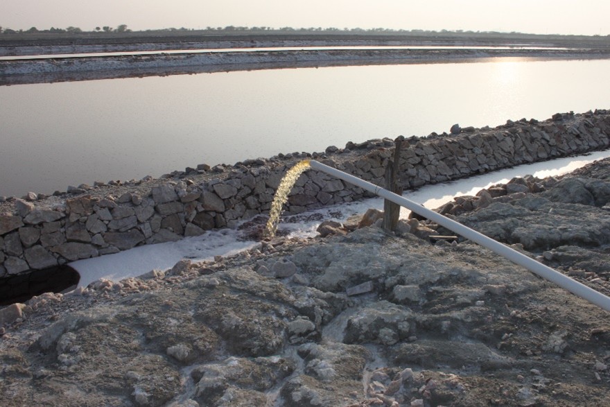 Crystallization pan from groundwater brine pumped from a borewell at Sambhar Lake.