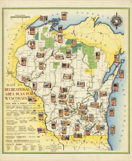 A 1939 map of existing and proposed areas of various designations for the recreational use of natural lands by the Wisconsin state government.