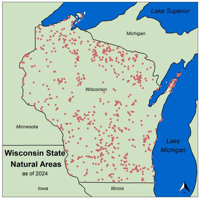 Wisconsin State Natural Area locations (burgundy dots) as of 2024.